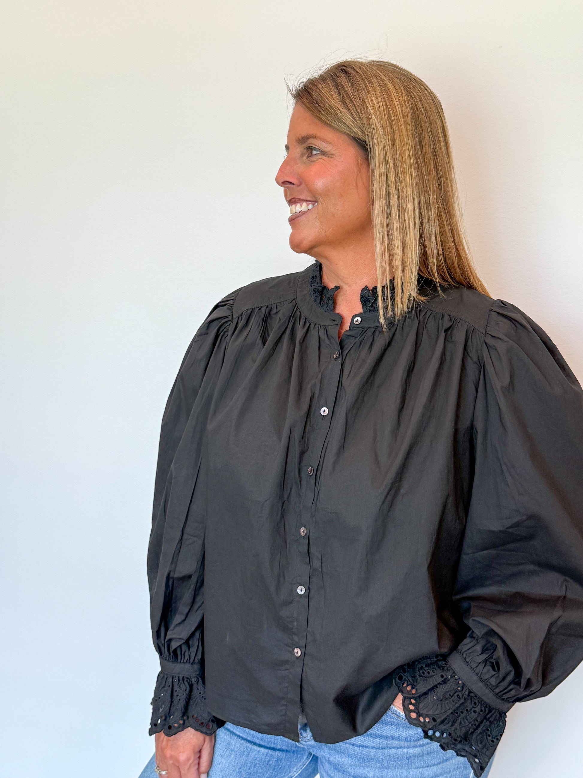The perfect elevated basic top. An easy top to dress up or down with the cute lace detailing around the sleeves and collar.