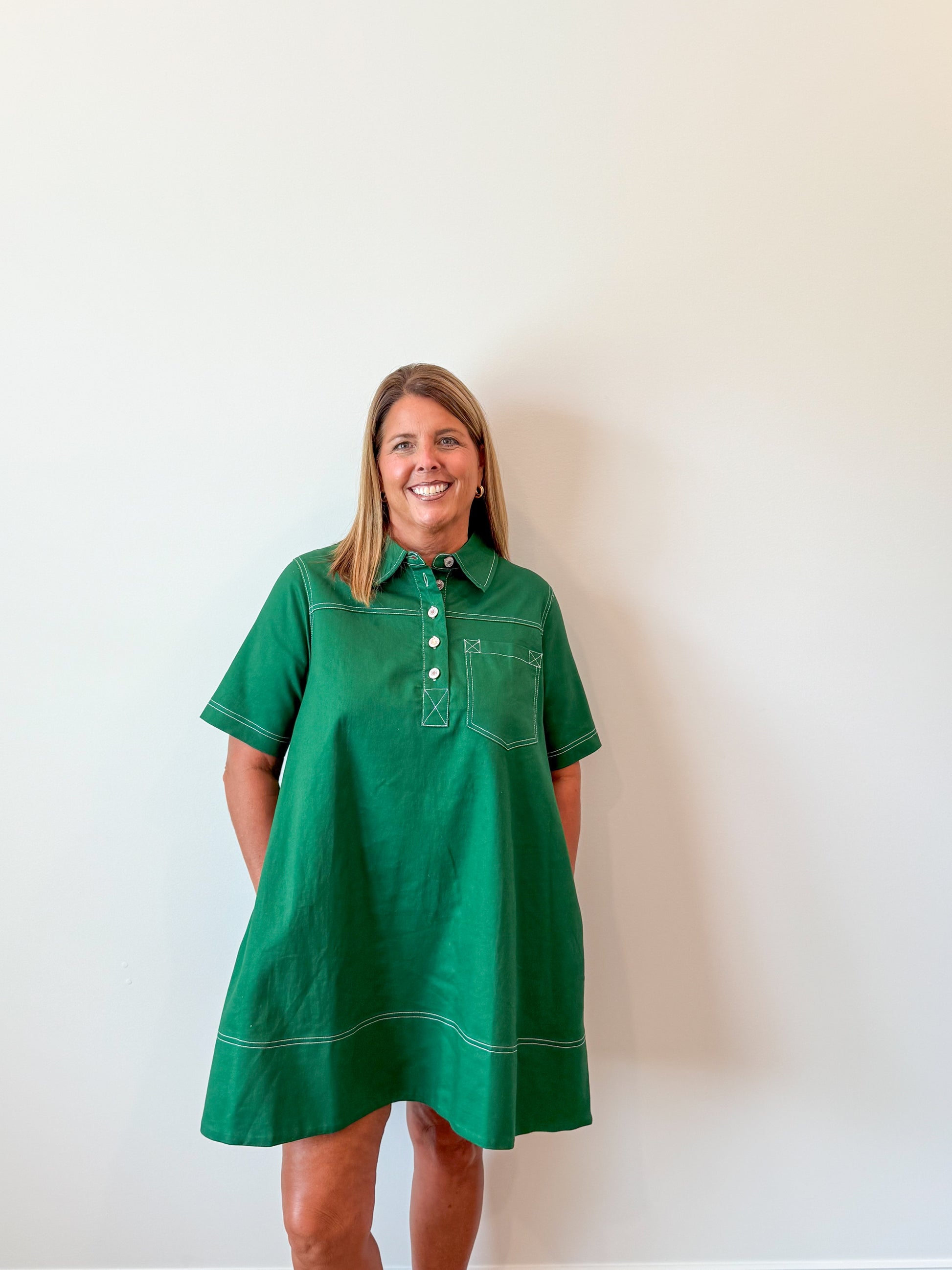 This Emerald green mini swing dress is the perfect every day dress. This mini dress features exposed stitch detail and the cutest shirt pocket, adding the perfect touch to your every day outfit. Perfect for any occasion!