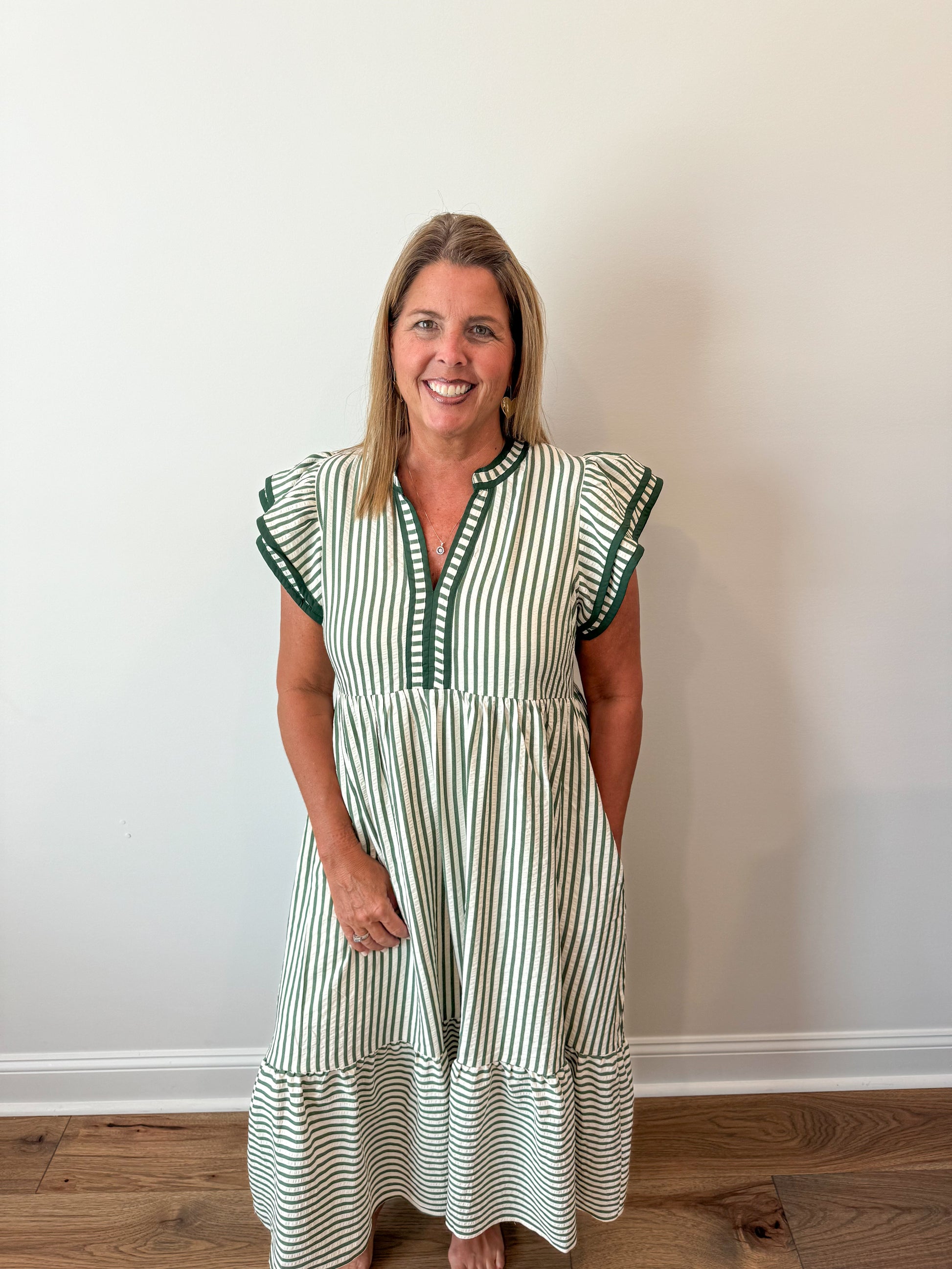 Step into style with the new Saylor Dress! This midi dress features ruffle sleeves and elegant v-neck detailing. The pine green stripes are the perfect touch to bring into the fall and upcoming holidays.