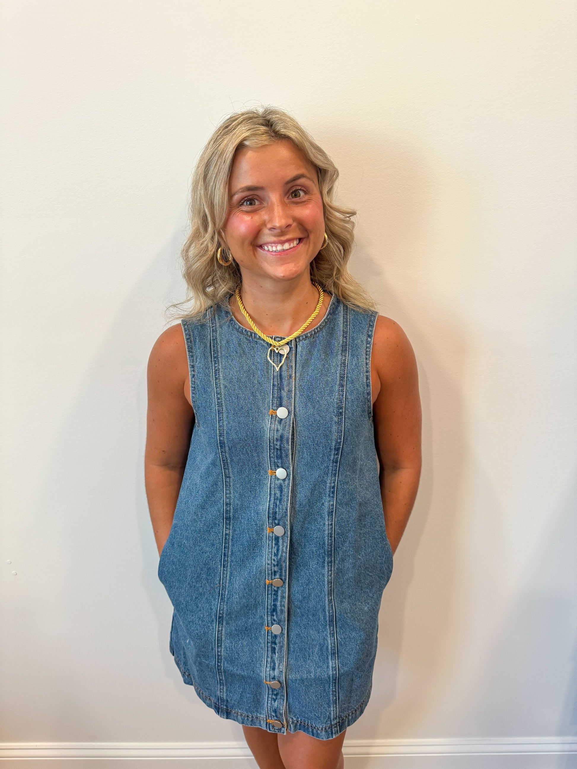 Step out in style with this cute, sturdy denim mini. This button down mini is an easy casual day dress or dress it up for a fun night out.