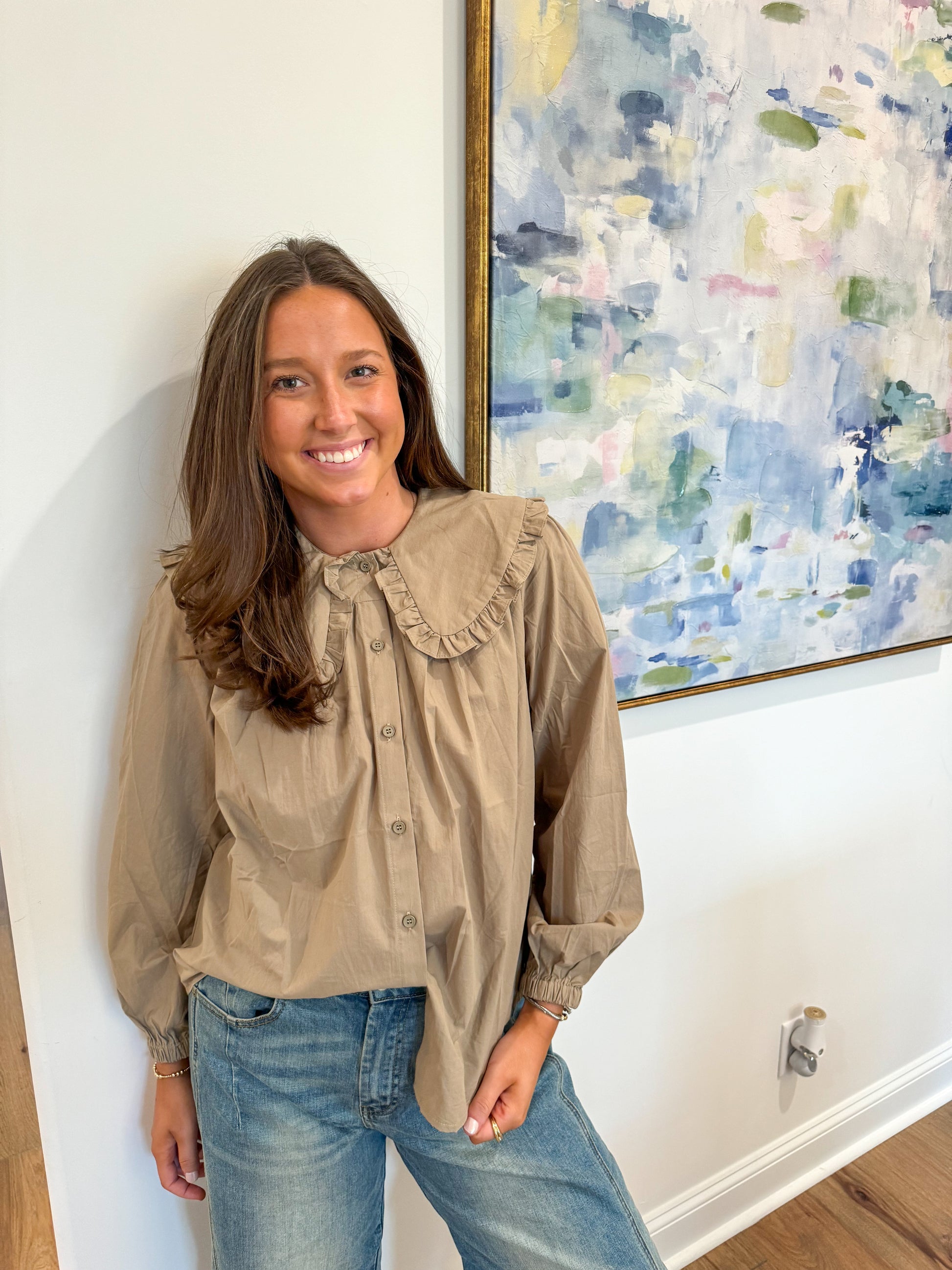 Taupe button up top with a fabulous peter pan color. This top is so stylish and fun all while still being a good staple neutral in your closet.